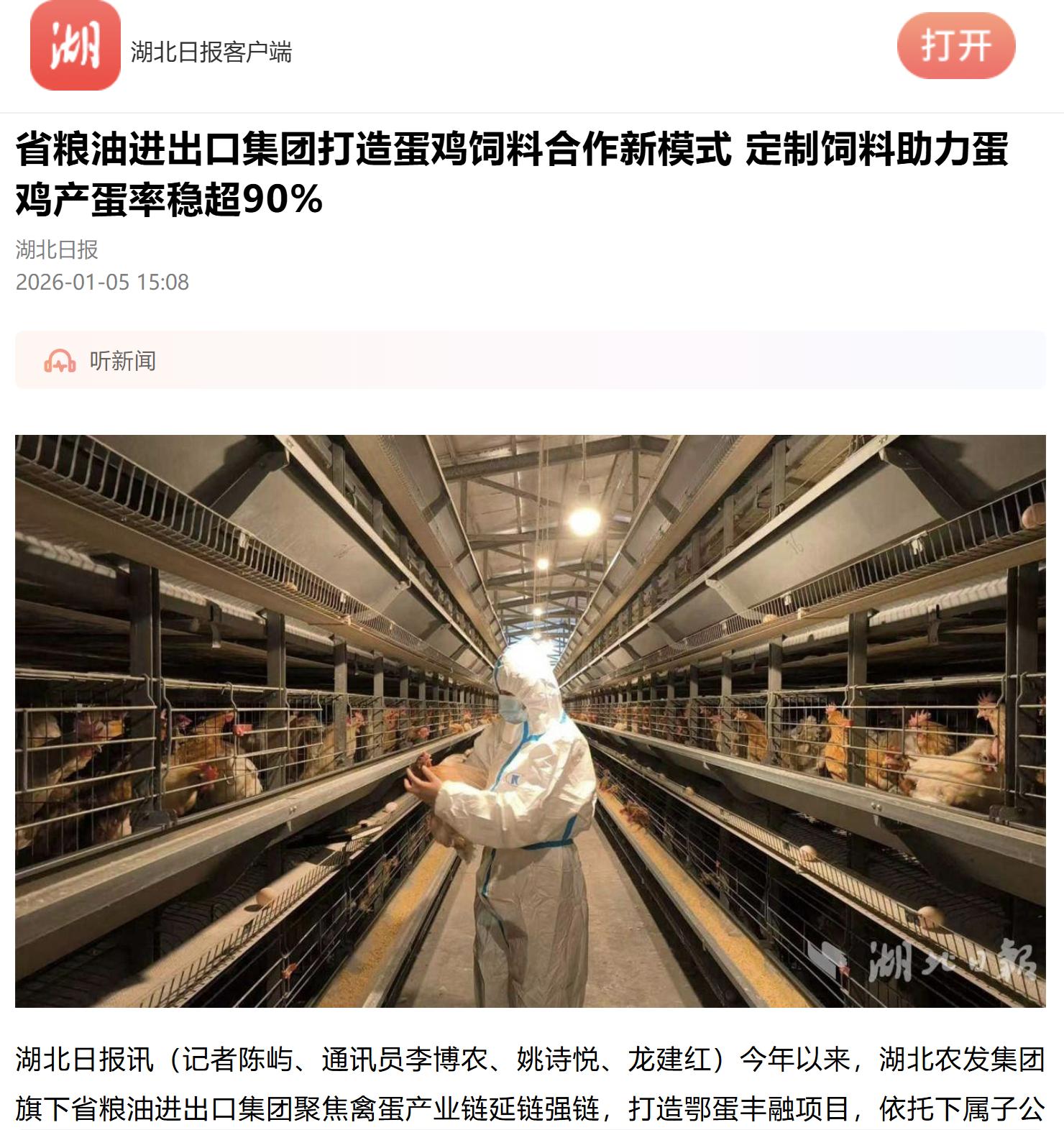 湖北日?qǐng)?bào):省糧油進(jìn)出口集團(tuán)打造蛋雞飼料合作新模式 定制飼料助力蛋雞產(chǎn)蛋率穩(wěn)超90%