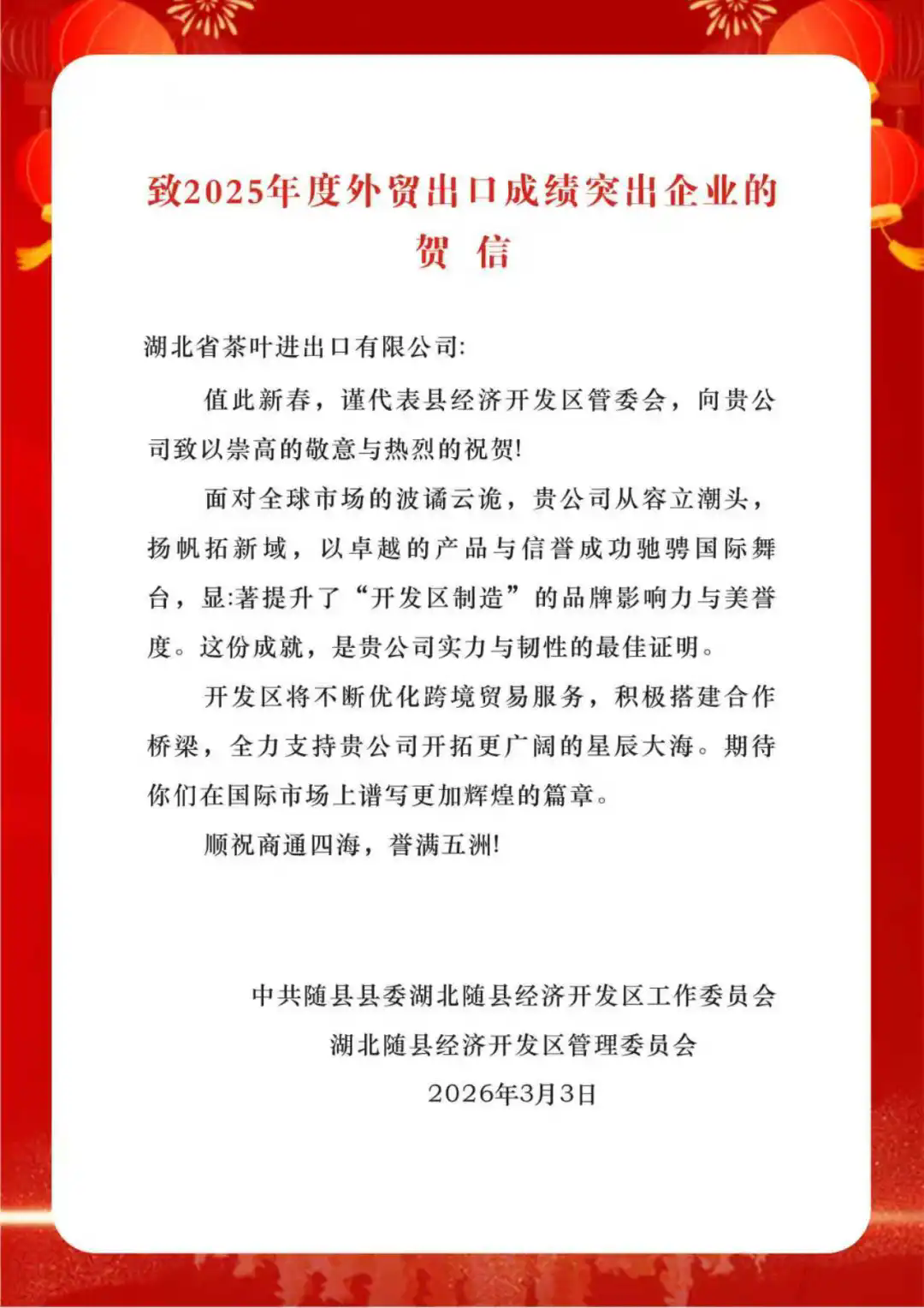 近日,湖北農(nóng)發(fā)集團旗下省糧油進出口集團茶葉進出口公司收到中共隨縣縣委湖北隨縣經(jīng)濟開發(fā)區(qū)工作委員會、湖北隨縣經(jīng)濟開發(fā)區(qū)管理委員會發(fā)來的《致2025年度外貿(mào)出口成績突出企業(yè)的賀信》,這份榮譽是地方政府對茶葉進出口公司成立首年外貿(mào)工作的高度認可,更是對企業(yè)深耕茶葉進出口主業(yè)、助力鄂茶走向世界的有力激勵。